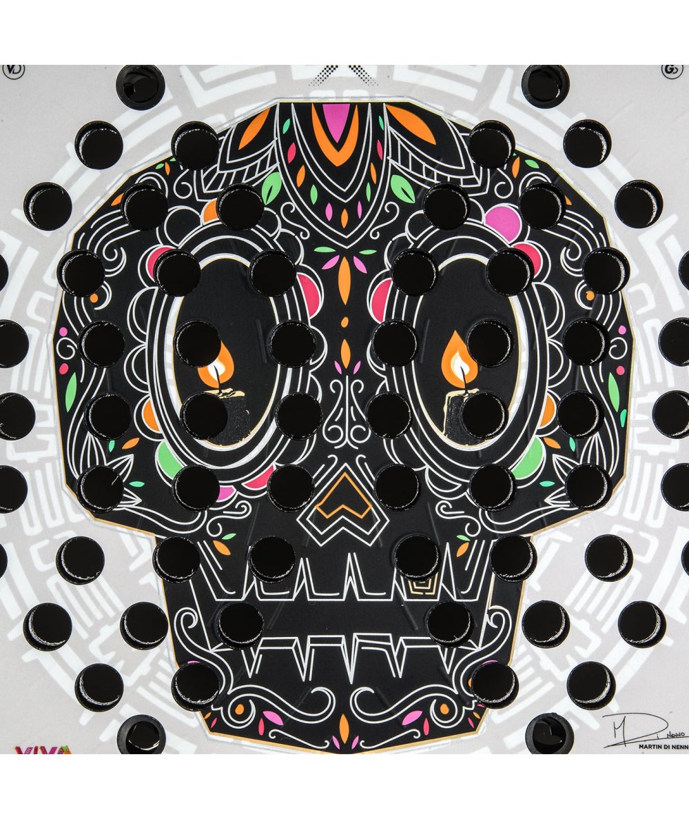 Its design is striking: a Mexican skull occupies the center of the composition on a pearly white base. Details in vibrant colors—pinks, greens, oranges, and golds—create a dynamic contrast that reflects the joy, color, and symbolic depth of this iconic festivity. Ornamental lines evoke the patterns of folk art, adding texture and visual dynamism to the racket. The large Bullpadel logo is elegantly integrated, reinforcing the brand’s identity within an aesthetic proposal that combines modernity, tradition, and respect for Mexican culture. As a distinguishing mark of the collection, it includes the signature of Martín Di Nenno and the legend “VIVA MÉXICO”, a symbol of pride and authenticity.